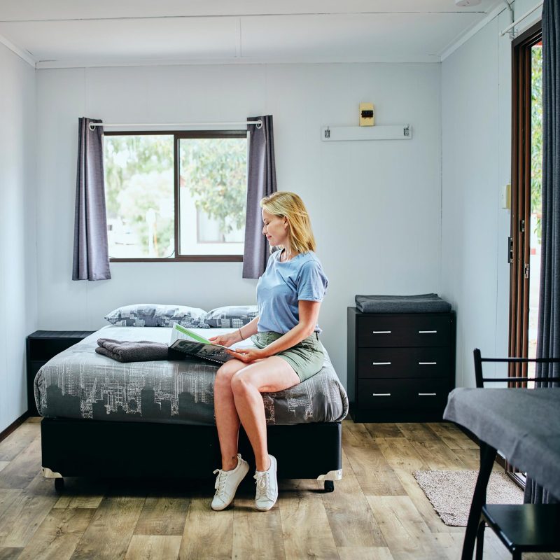 A cosy cabin for two, featuring a double bed, ensuite, air conditioning, well-equipped kitchenette, and an LCD TV with DVD player for a comfortable stay.
